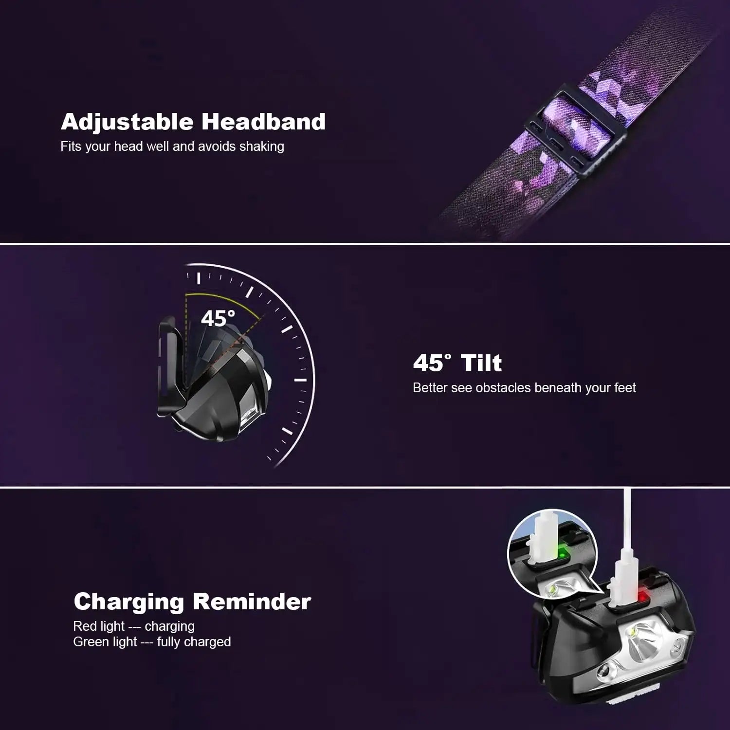 - Comfortable & Adjustable:The running lights for runners uses comfortable elastic headband, which can easily adjust the length to perfectly fit your head size, perfect for adults and kids. The 45-degree tilt lets you direct light exactly where you need it. Weighing only 2.4 ounces, it is perfect for long treks and running.