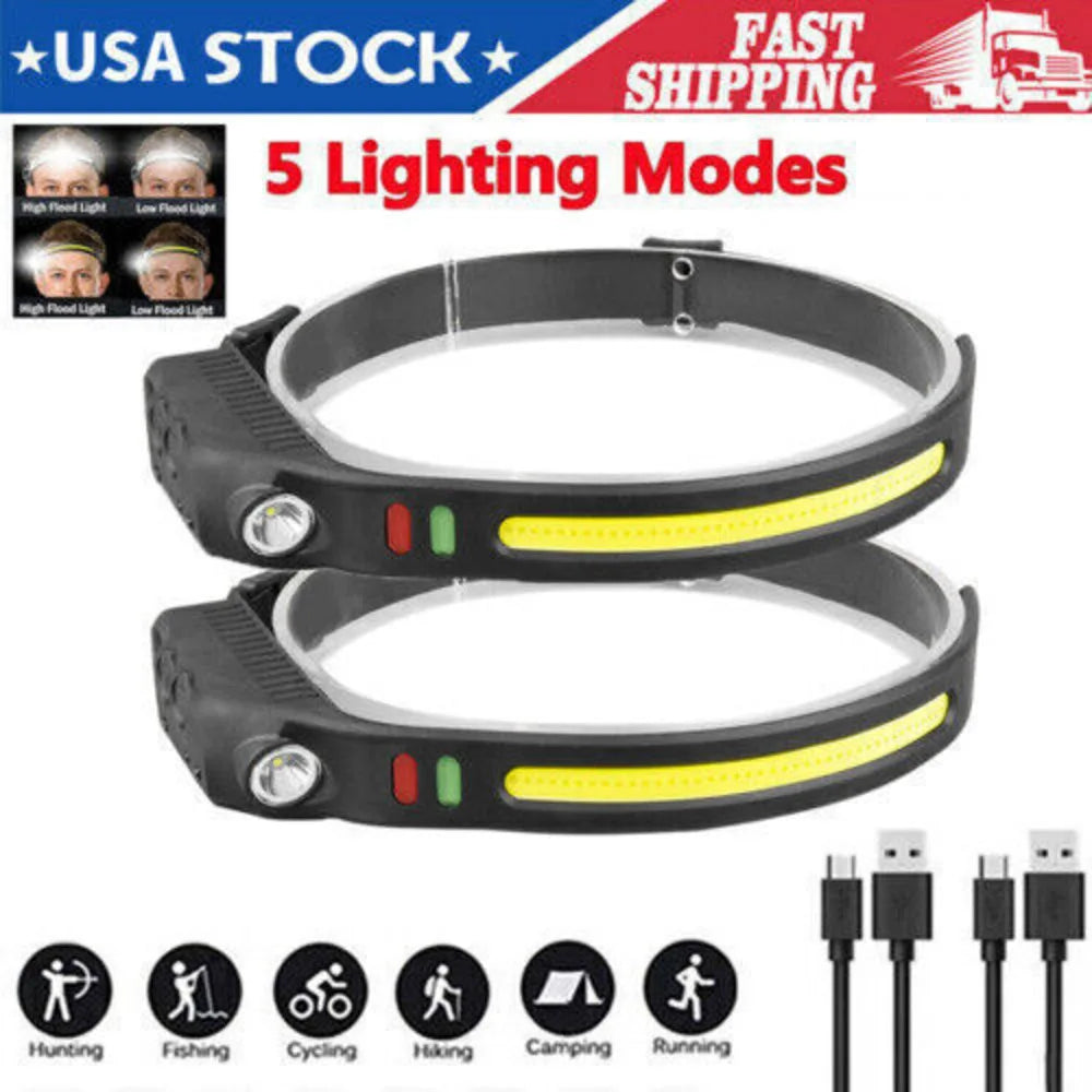 2PCS COB LED Headlamp Headlight Torch Work Light Bar Head Band Lamp USB Charging