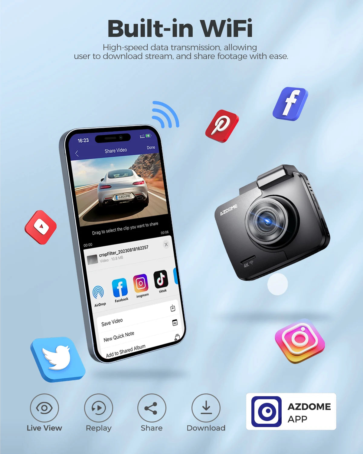 - Built-in GPS and Wi-Fi: Track your driving route and speed, with the option to download videos directly to your smartphone via the AZDOME app.