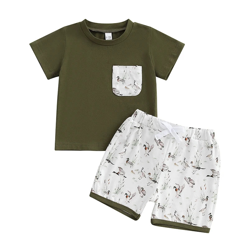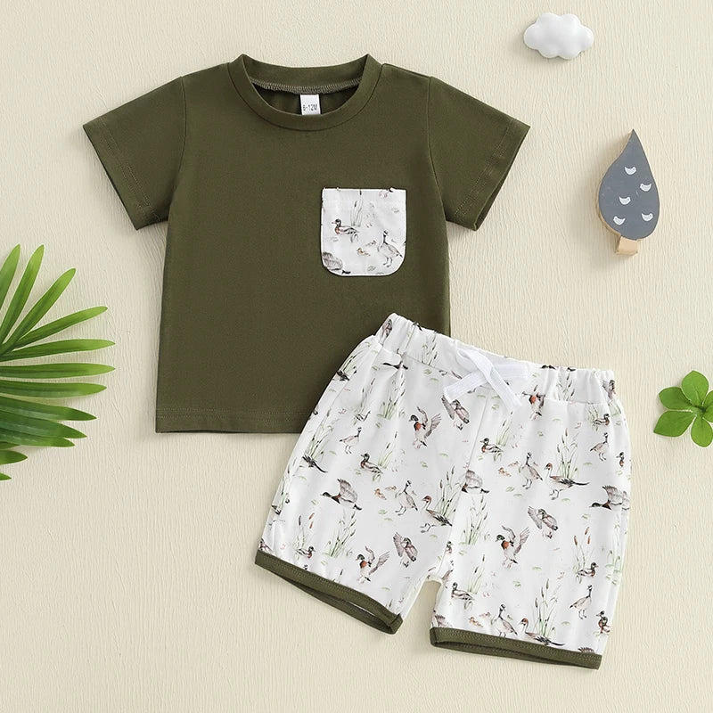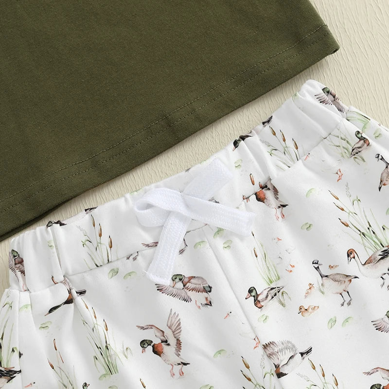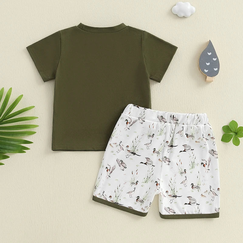Boys Summer Outfit Sets with Short Sleeve O Neck Tops and Cute Duck Print Drawstring Shorts - Casual and Comfortable Summer