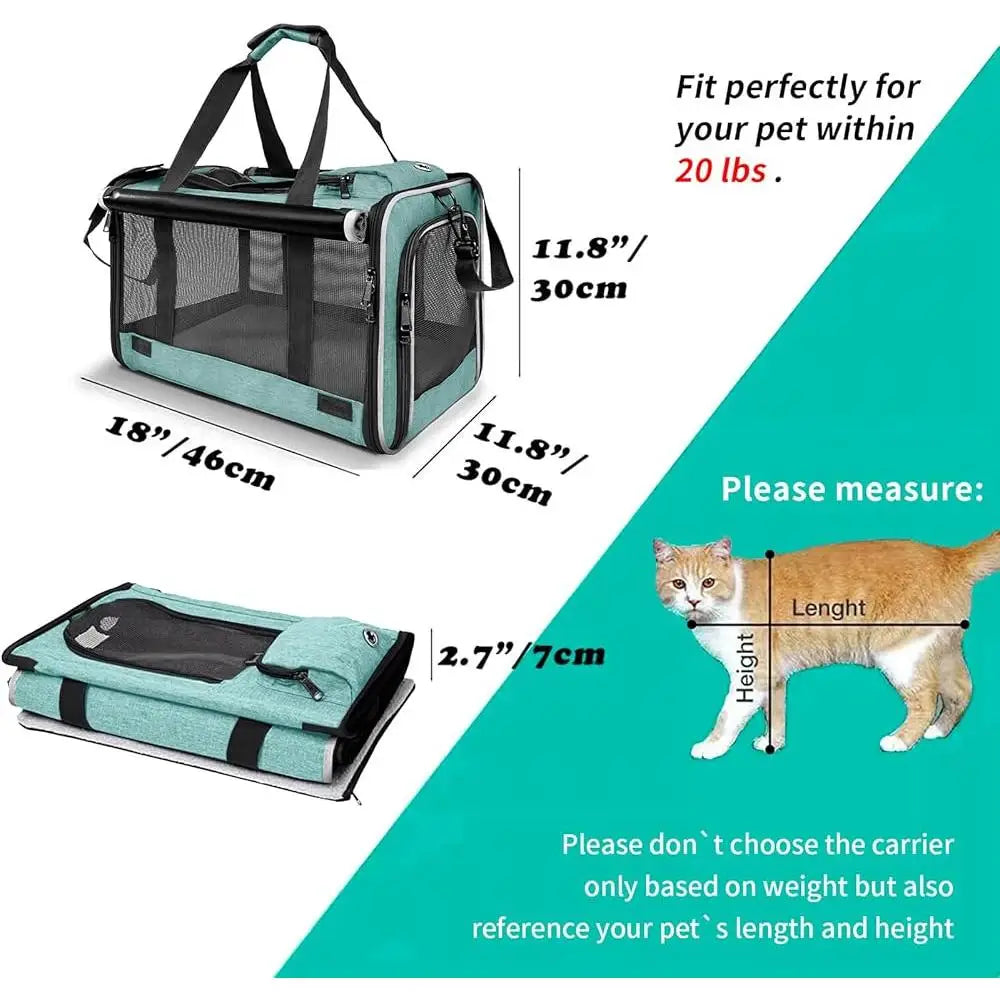 About this item LARGE SIZE pet carrier for medium, large cats or small dogs, HIGHER AND WIDER than other carriers on market, Recommended max load of 20 lbs (9 kg). Measures: 18. 1"L x 11. 8"W x 11. 8”H. Please don't choose the carrier only based on weight but also reference your pet's length and height. large cat carrier designed mesh all around to ensure normal circulation of air inside the box and easy for you to check on your pet. These roller blinds can be put down if your pet feels nervous. The cat carrier can be folded into a pad to save your storage space and is easy to take out. Top and side entry. The large cat carrier is made from durable fabric-oxford material, and the faux lambskin liner which offers a cozy space for your pet can be removed entirely and machine-washed. Designed for two carrying ways-shoulder straps and handles will be adjusted as you need. Filled the soft cotton into the cat backpack shoulder strap, and increased the width on it, helping to reduce load and relieve fatigue.