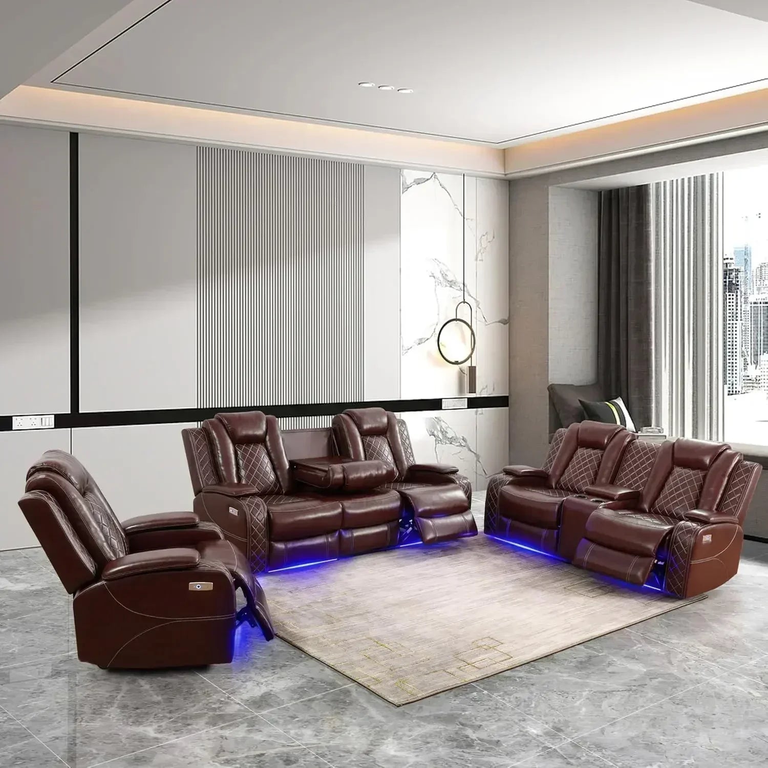 Leather Recliner Sofa Couch Set with Light,Power Reclining Sofa with Drop-Down Table Living Room Sofas Set (Sofa+Loveseat+Chair)