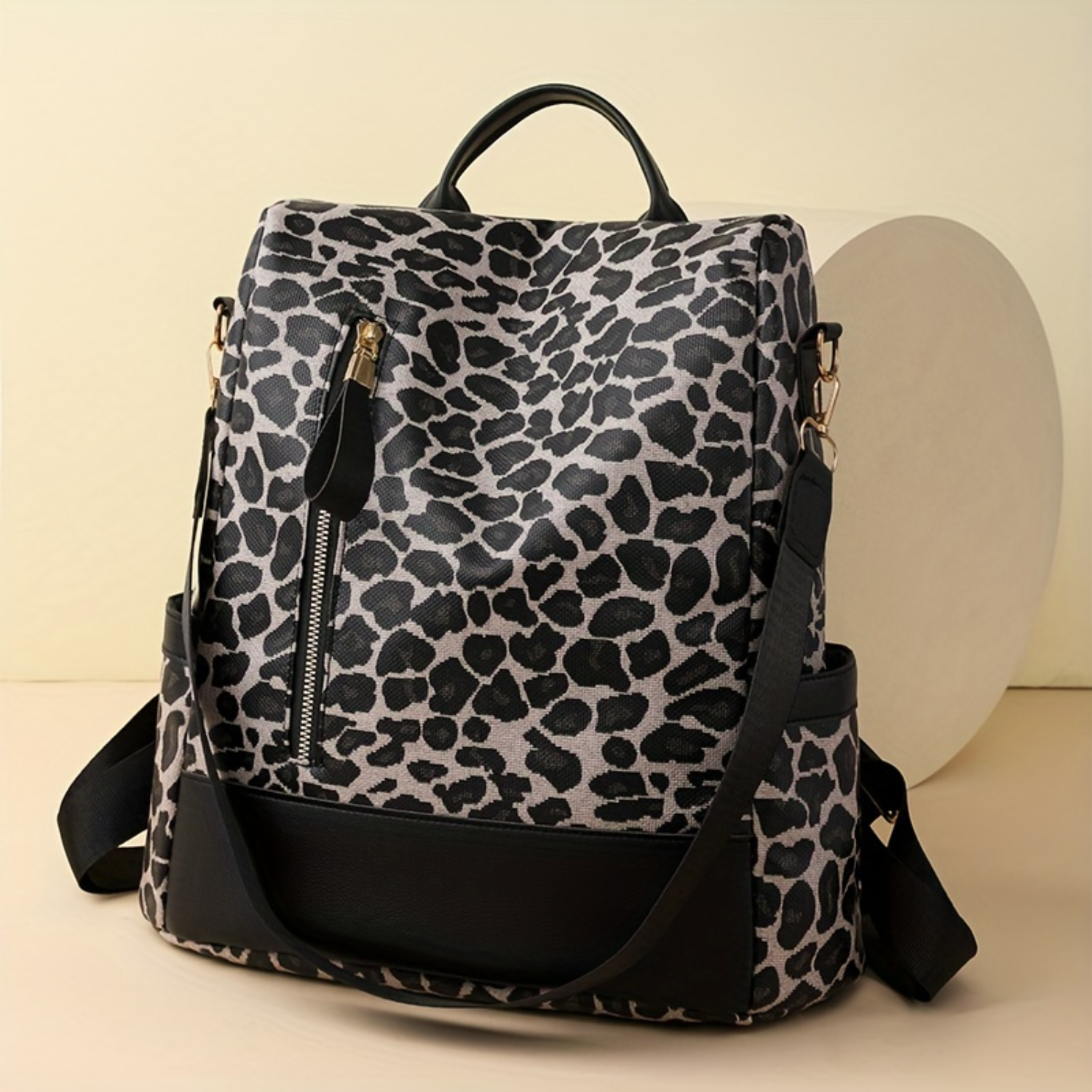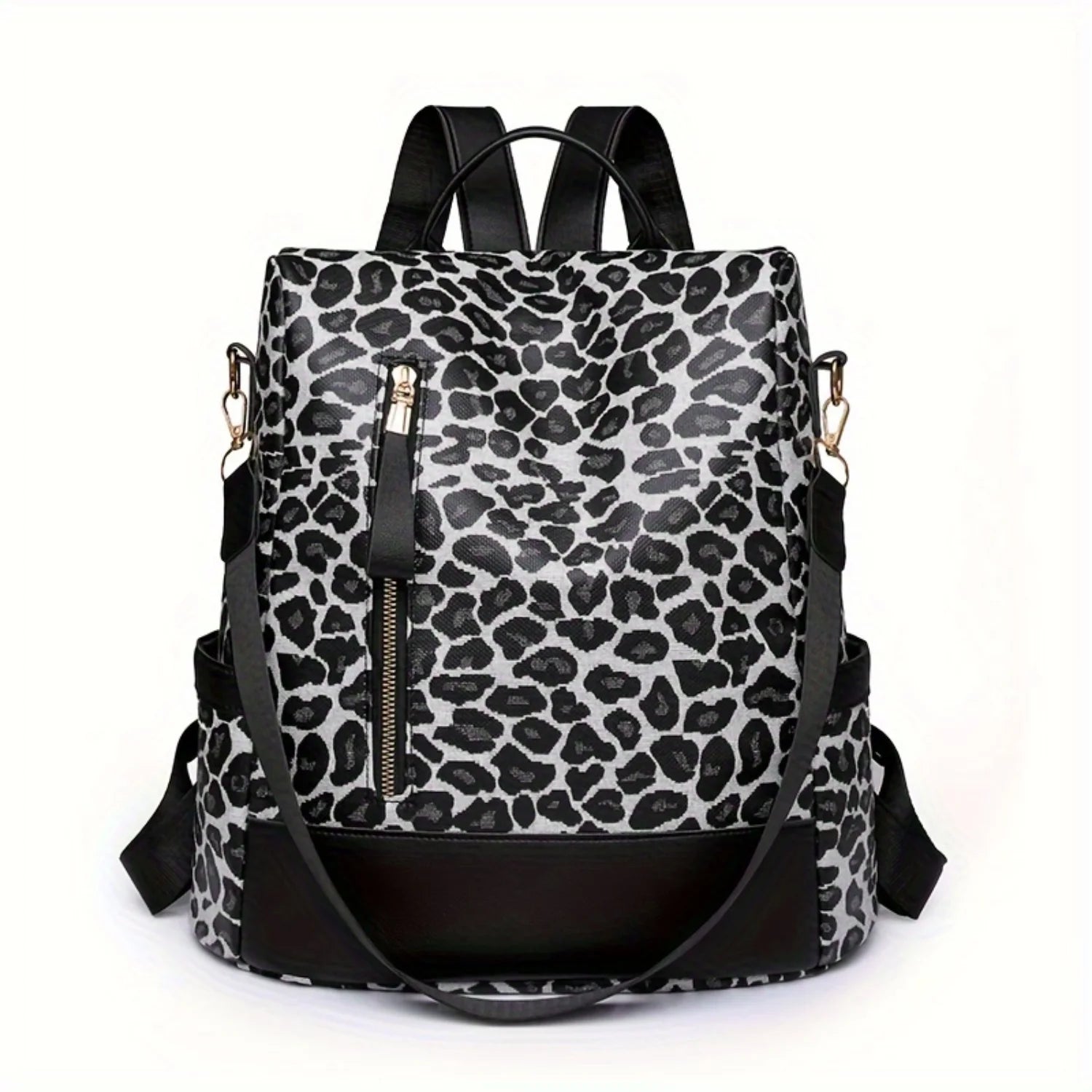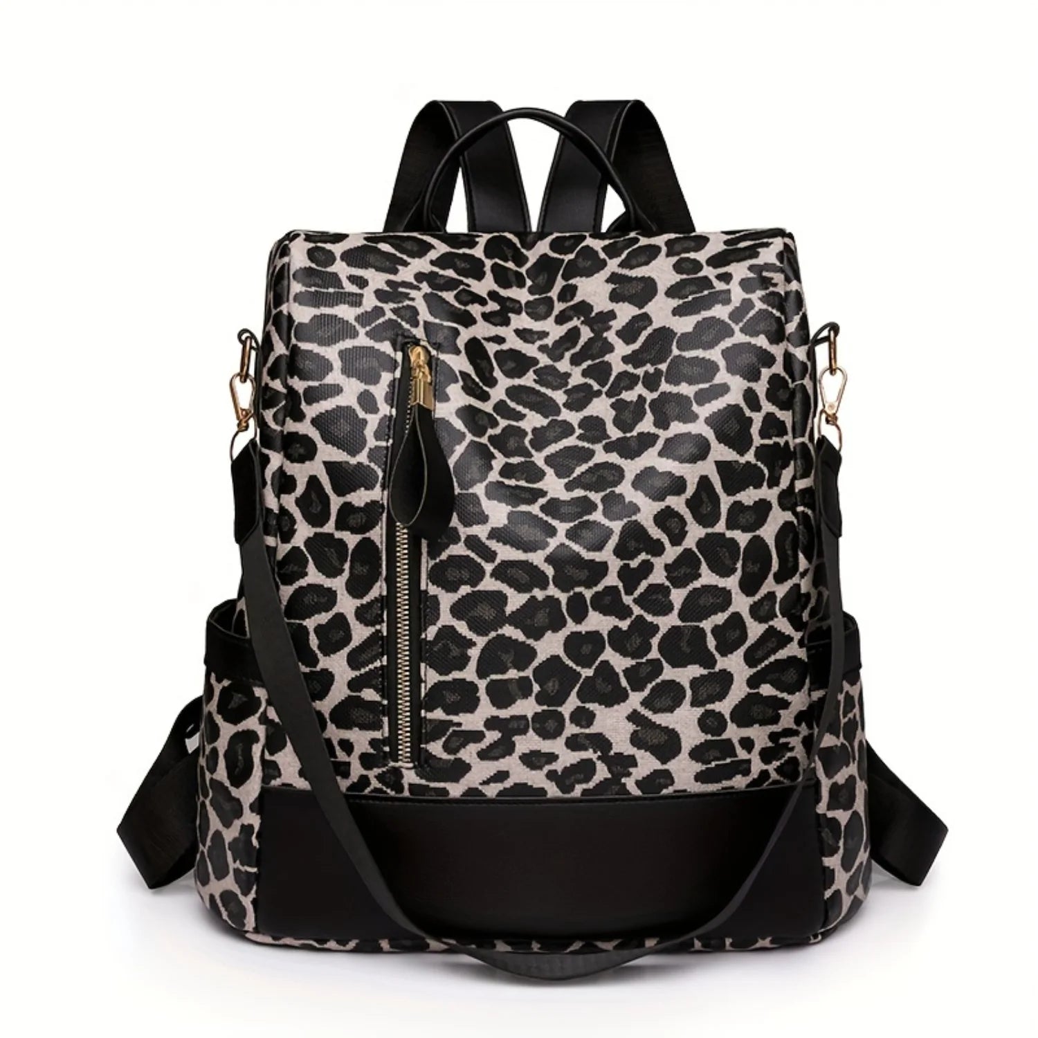 1. Stay stylish and secure with our Leopard Print Backpack Purse, featuring a zipper closure and adjustable strap for convenience on the go.