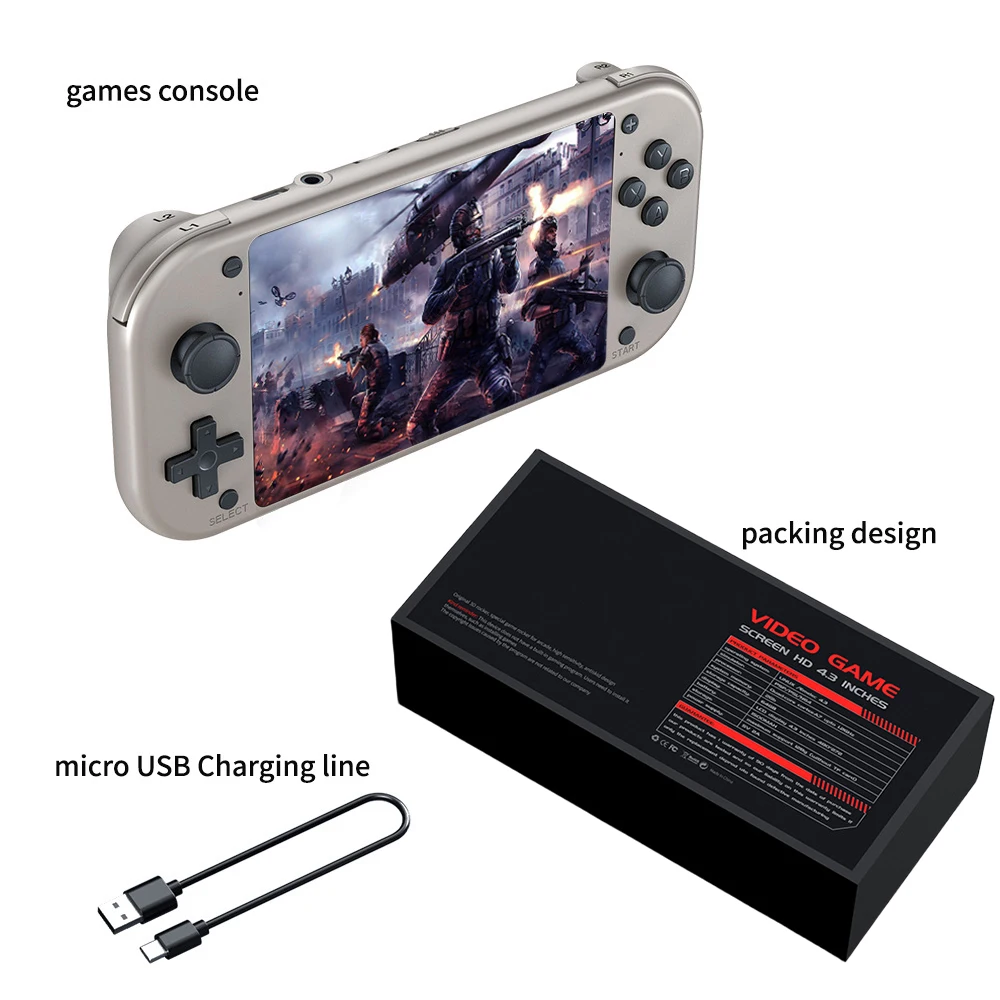 Packing list: 1 handheld game console, 1 charging cable, 1 manual