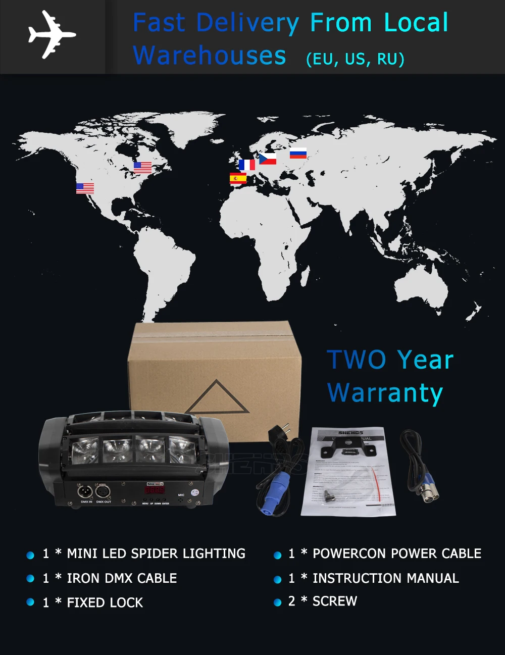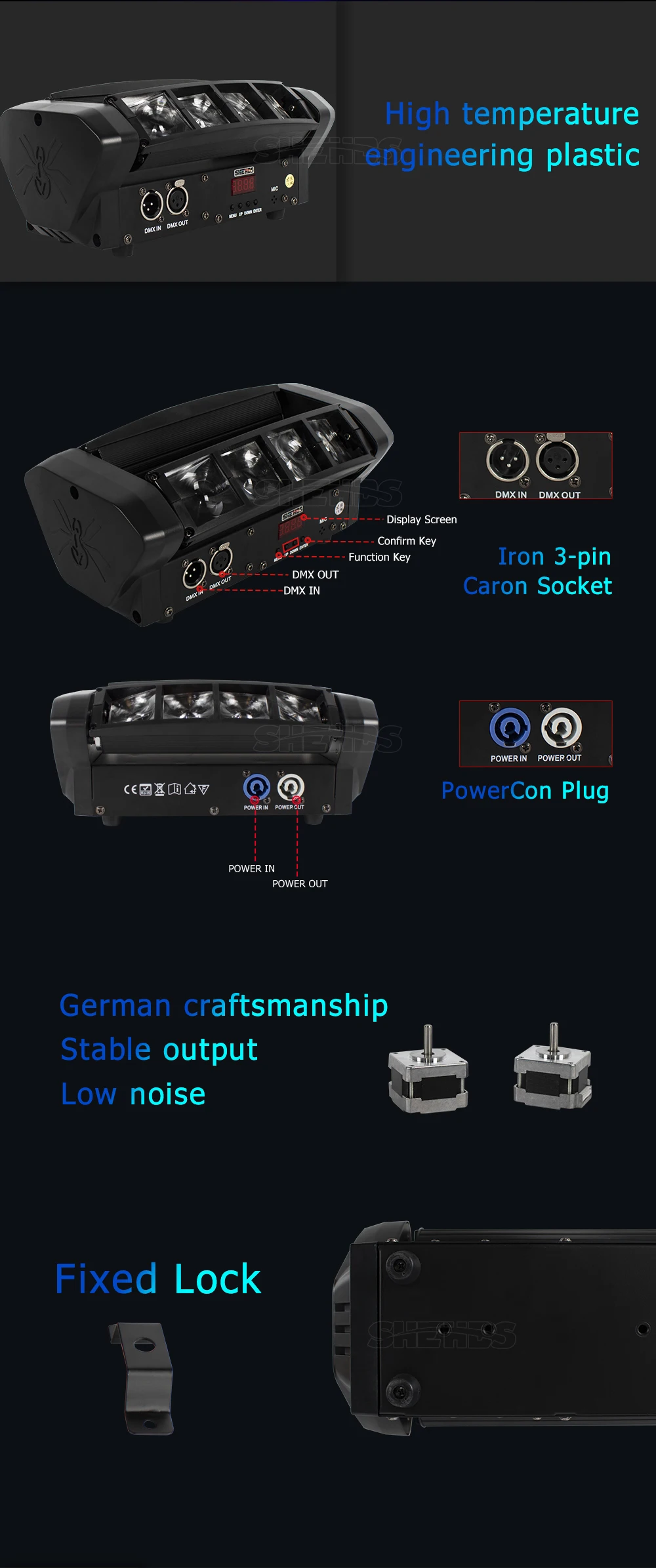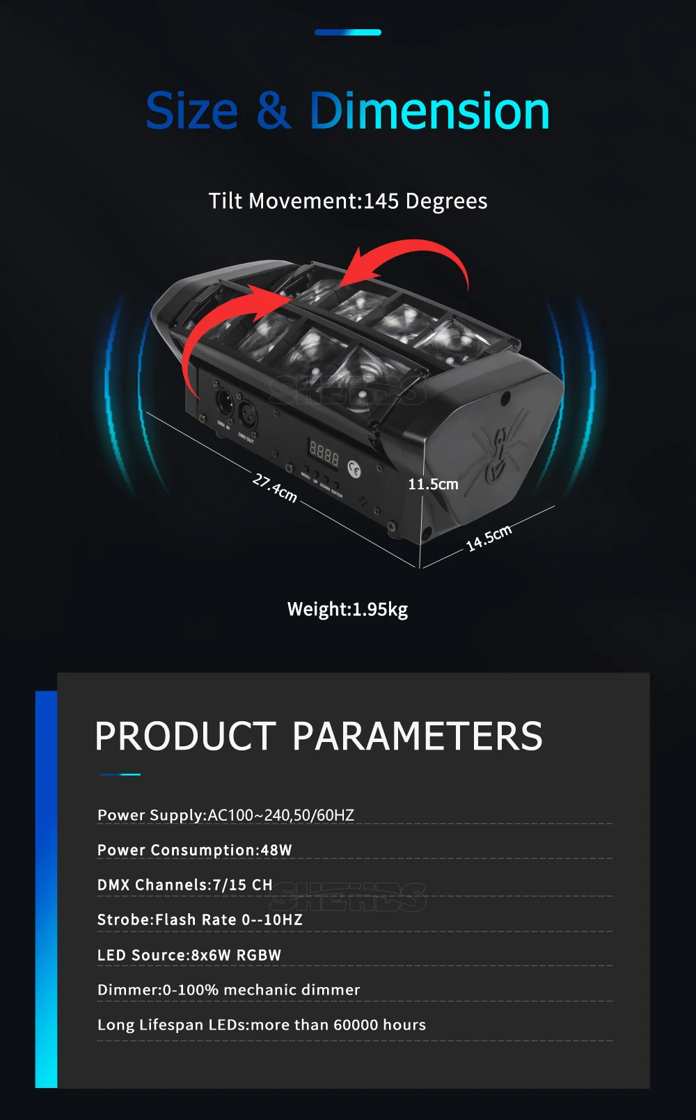 Operational Modes: DMX512,Auto Run,Sound action,Strobe,Stand Alone and Master/Slave,With Rich Advanced Built-in Program