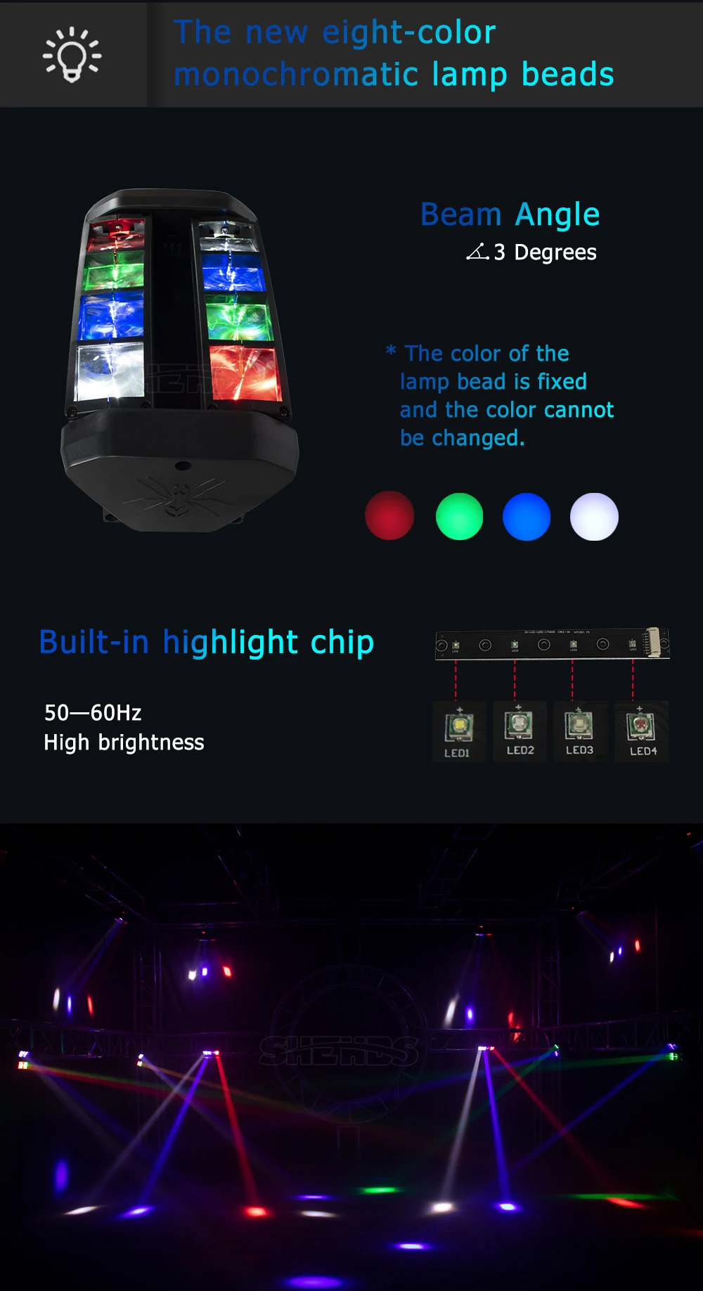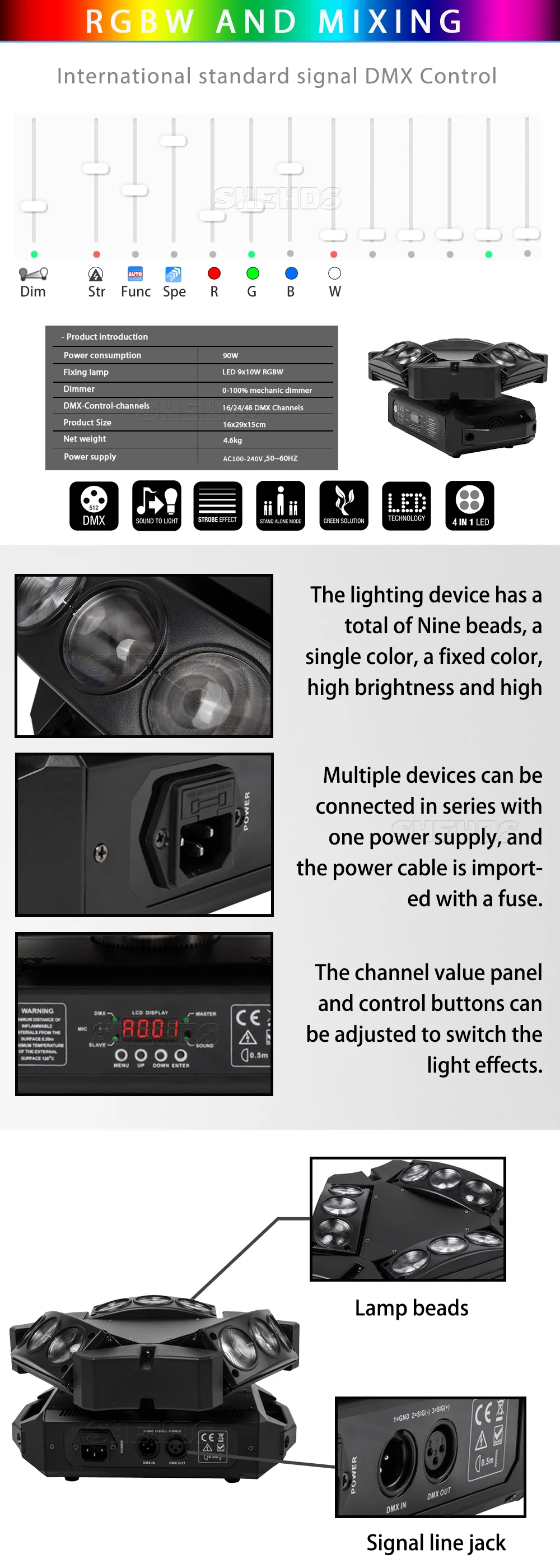 * LED Source:8x6W Red,Green,Blue,White and mixed color