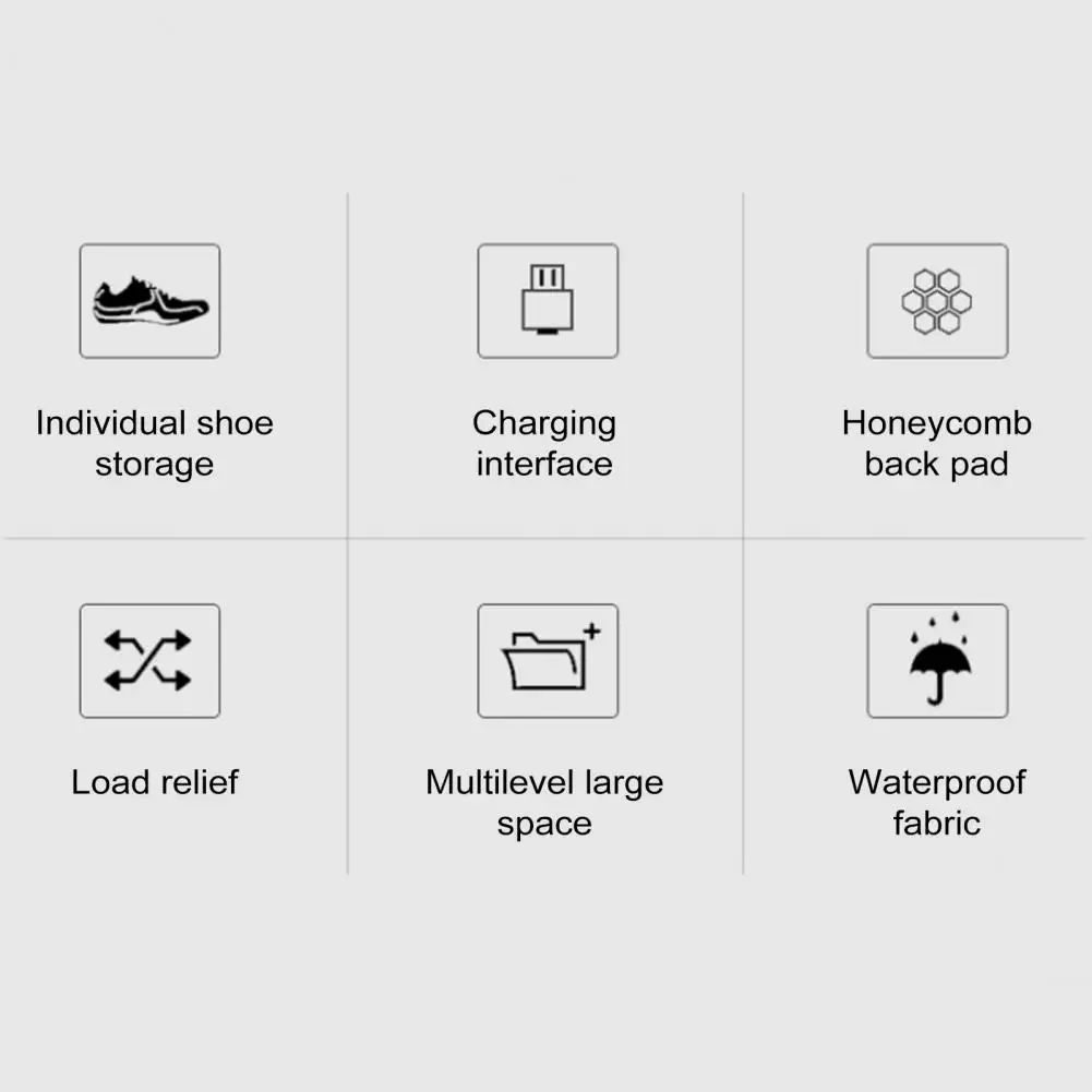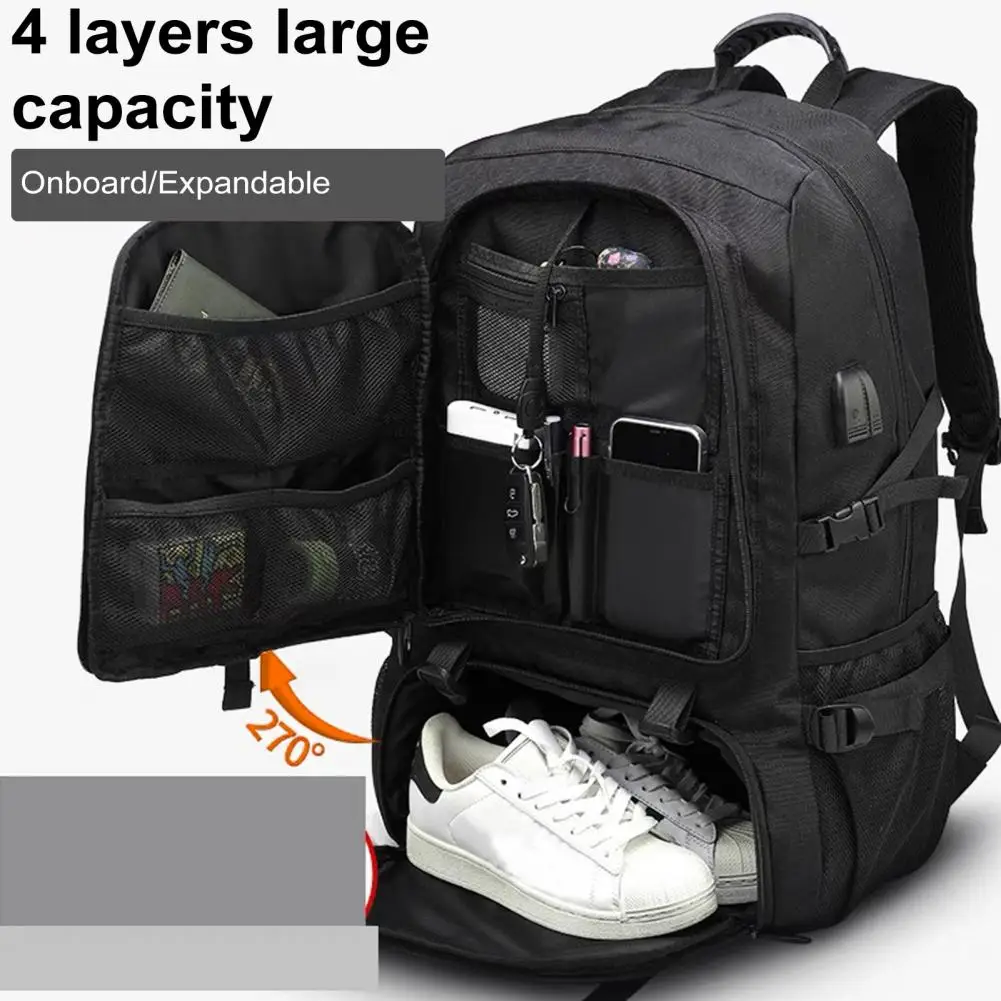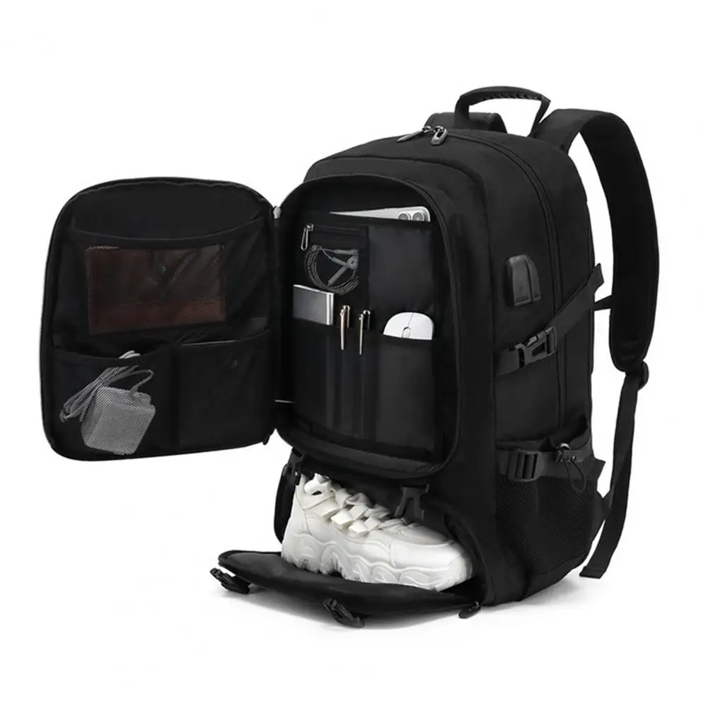 Feature-Packed Design: Equipped with an independent anti-dirty shoe compartment, fully open front pocket, and the ability to accommodate an 18-inch game laptop, this backpack is designed for convenience. Additional features include a trolley case fixing strap, anti-theft back pocket, multiple compartments in the front pocket, mesh storage bag in the main compartment, 180-degree flap storage in the front pocket, and a USB external interface for charging your devices on the go (USB charger not included).