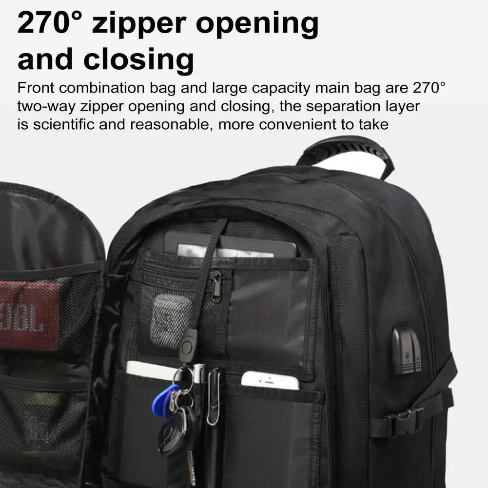 Organized Storage Solutions: Featuring an independent anti-dirty shoe compartment, fully open front pocket, 18-inch laptop capacity, trolley case fixing strap, anti-theft back pocket, multiple compartments, mesh storage bag, and USB external interface for convenient charging on the go.