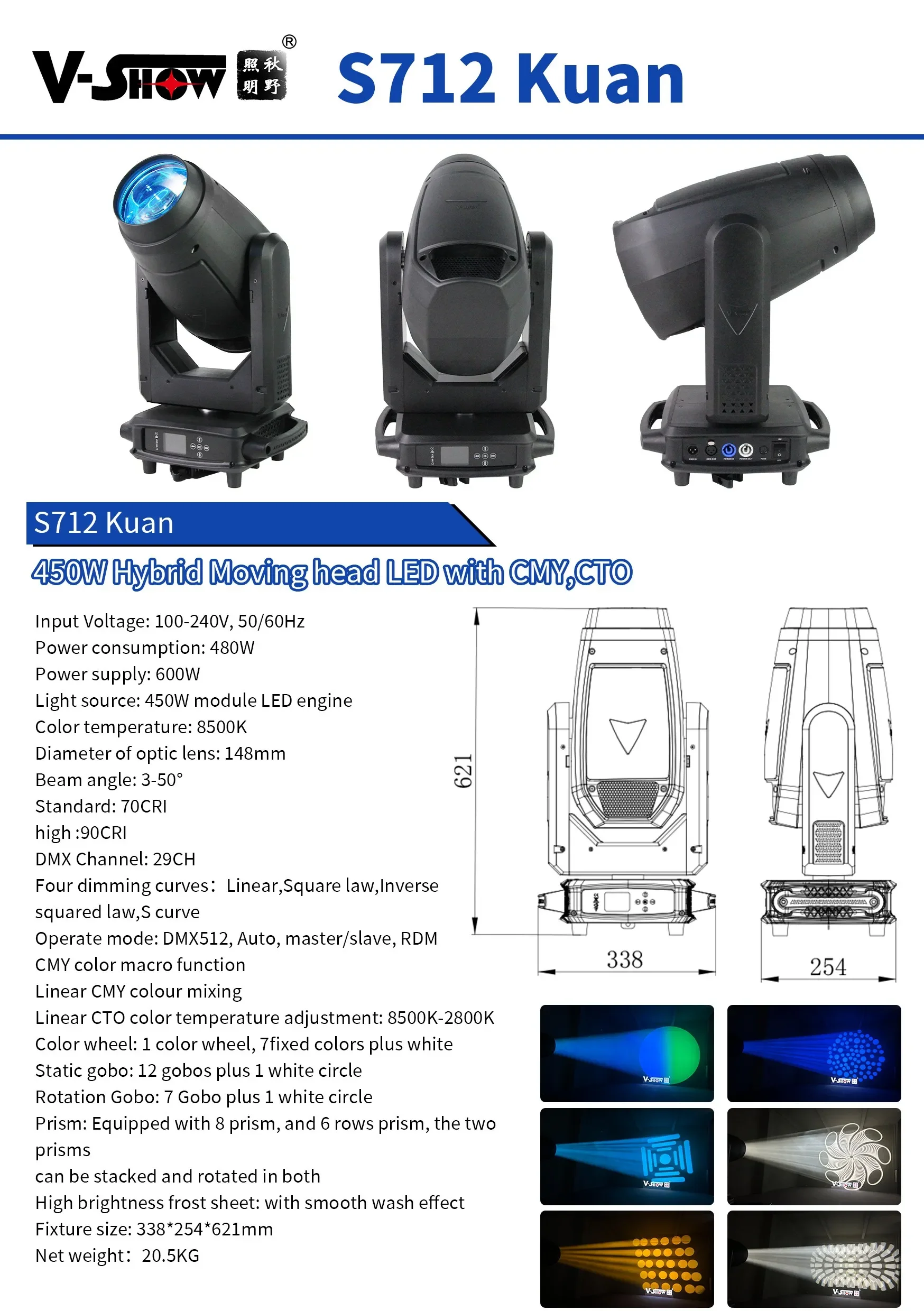 VSHOW S712 Led Module 450W With Folding Clamps Beam Wash Spot BSW Hybrid 3in1 With Zoom CMY CTO Moving Head Light